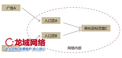 举个例子:假如你的网站有 A、B、C 三个页面,现在你要在站外投放广告推广 C,即访客到达转化目标页面 C 就定义为转化成功。站外广告一个是 a,一个是 b,分 别放到不同其他网站广告位上。其中,点击站外广告 a 跳转到你网站的页面 A,站外广告 b 跳转到页面 B。这样,页面 A 相对于站外广告 a 是它的入口页;同样,B 是站外广告 b 的入口页。通过访问入口报告中 A、B 页面的转化指标,就能看出到达页面 C 完成转化的贡献,假设页面 A 和广告 a 搭配的转化要好,则从 A 入口页开始的访问次数和 PV 高,说明用户浏览这个页面比较多,可以通过数量考量这个维度;另一方面,A 进入的转化次数比较多说明了更多的转化到 C 页面。那我们就 不难理解通过 A 页面的转化率了,这个比率(转化次数/访问次数)高,说明从该入口页来的流量大部分都转化 C 页面成功。