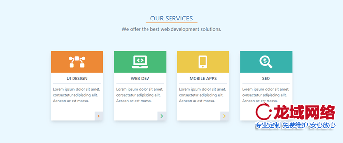 接下来,我们将flex容器用于服务项目。我们使用,flex-wrap以便项目将调整大小。我们为每张卡设置尺寸,并添加一些空间和阴影。每张卡都有一个带有主题图标,标题和描述的彩色部分。我们还在右下角放置了一个带有图标的按钮。